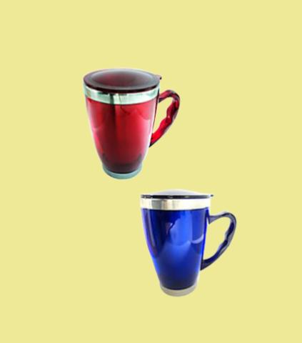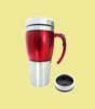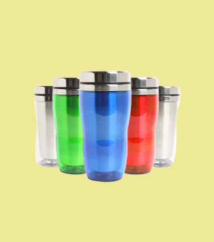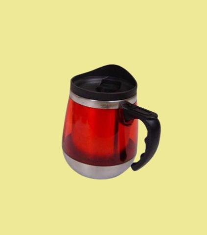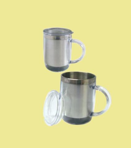 | Caneca em aço inoxidável c/tampa e acabamento externo em plástico transparente |